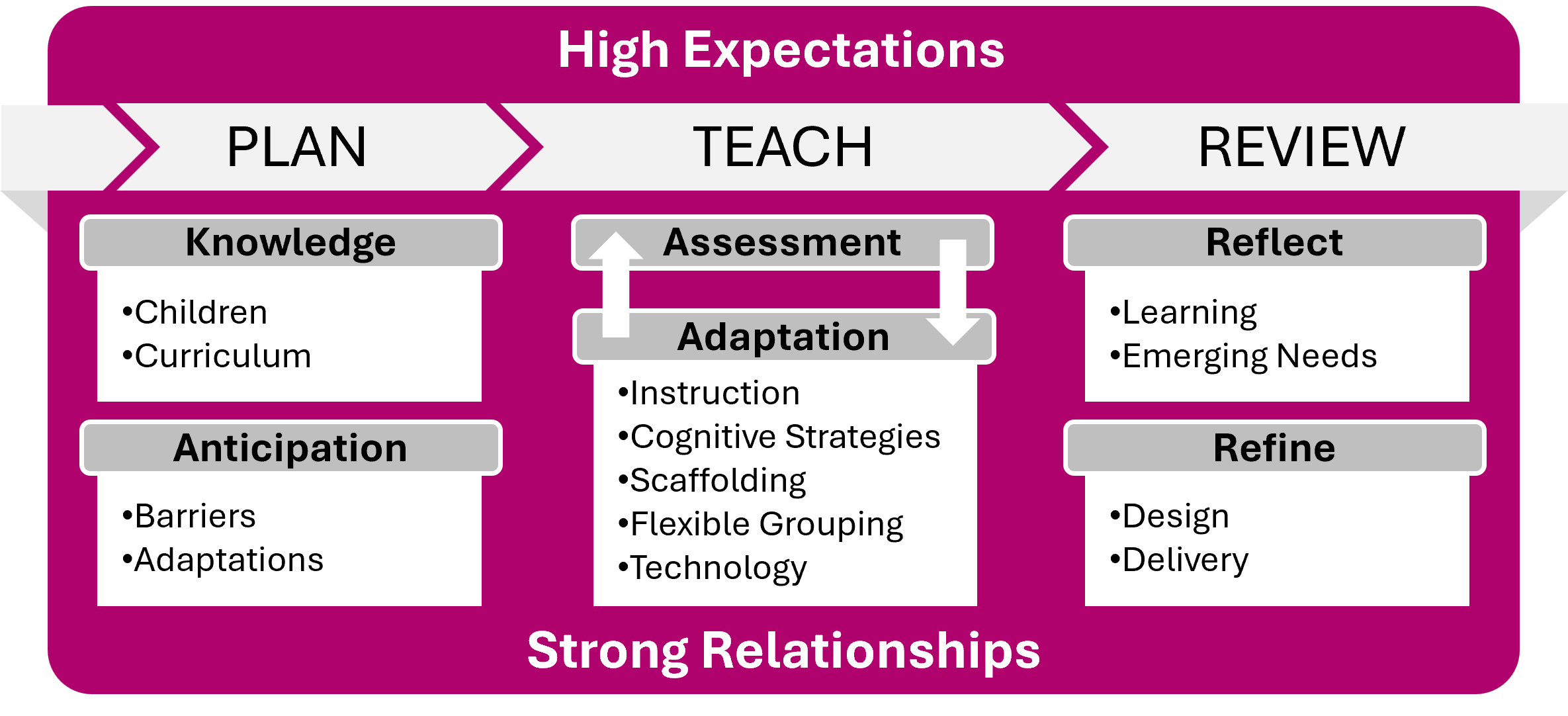 The image below outlines our approach to Adaptive Teaching across the CLF and highlights how the foundations of HIGH EXPECTATIONS and STRONG RELATIONSHIPS are the crucial enabling conditions that unlock everything else.