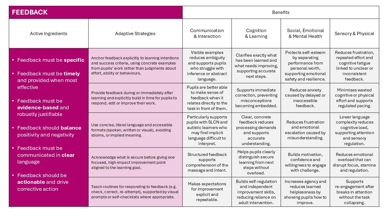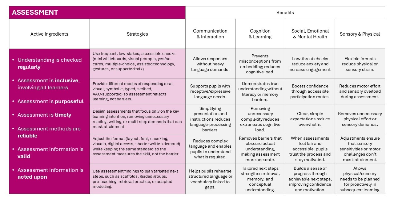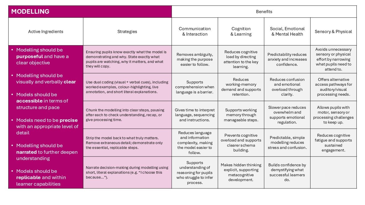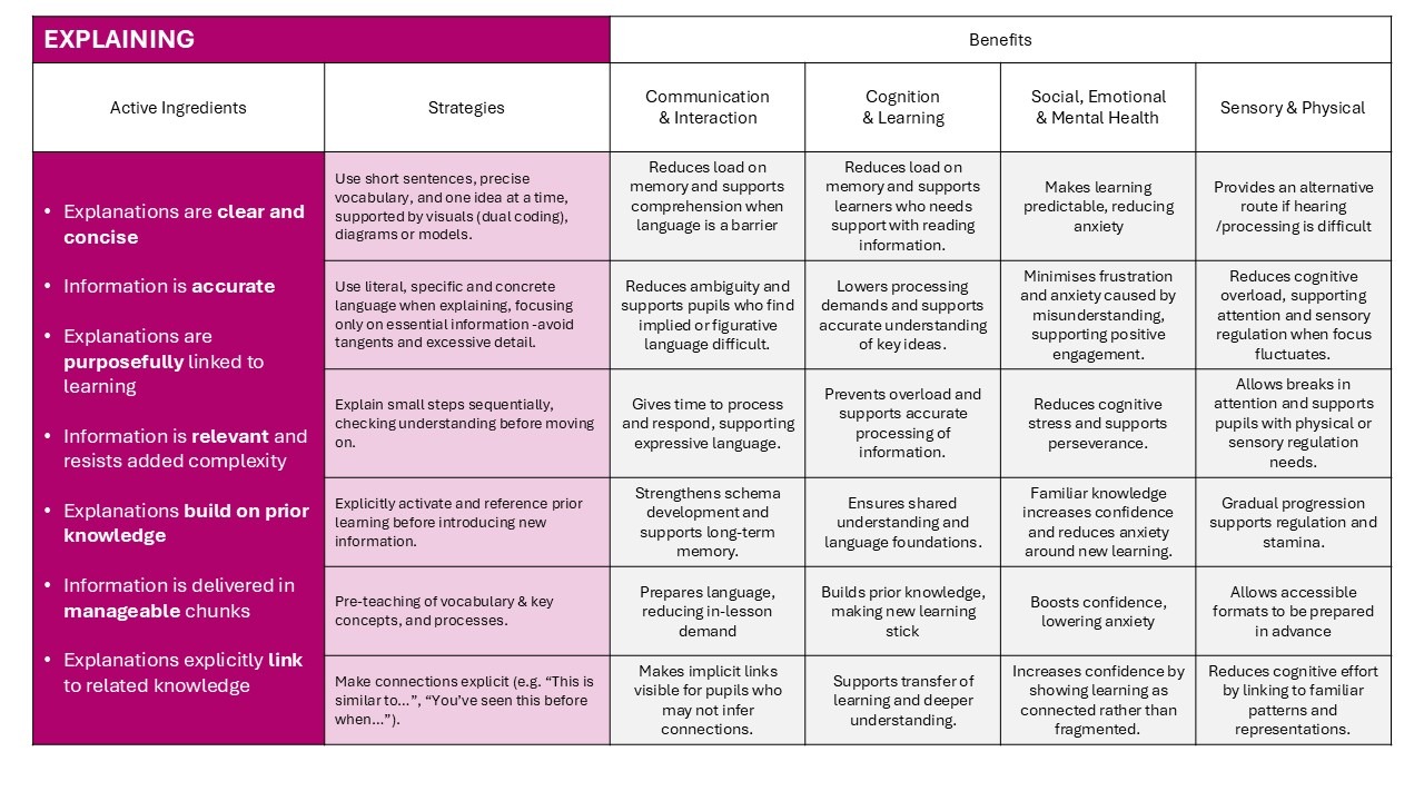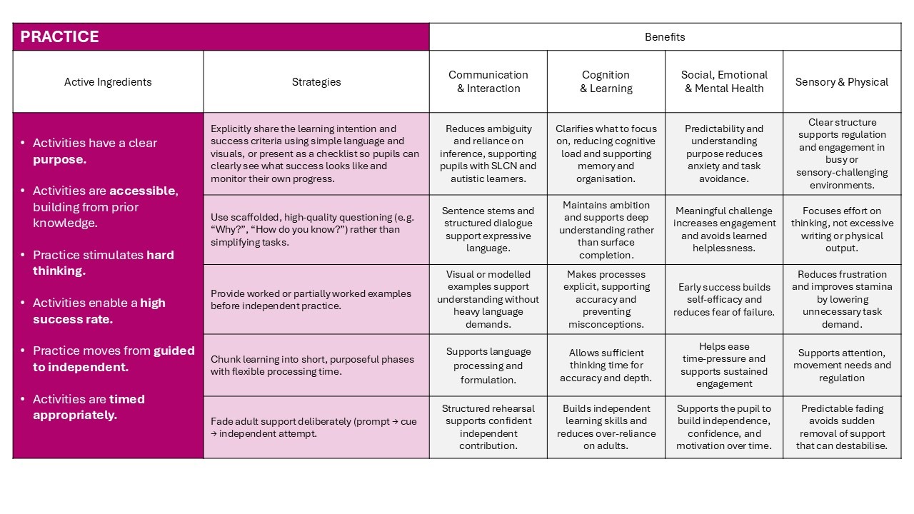 Below are a series of images that highlight the essential characteristics (active ingredients) that teachers must ensure are present during their planning some adaptive strategies that they can consider in relation to the needs of their class.